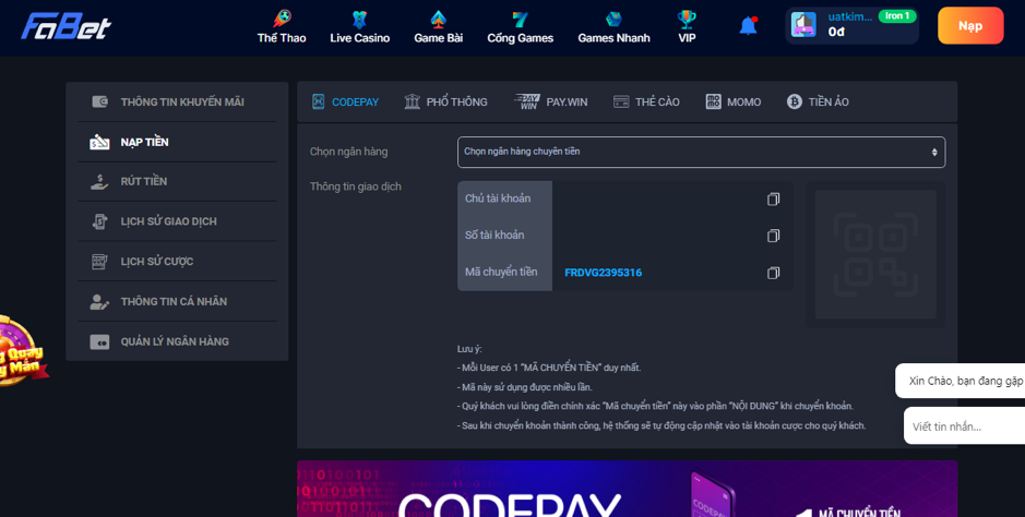 Mã chuyển tiền là một mã số duy nhất được FaBet cung cấp cho mỗi giao dịch Codepay. Thông thường, thời gian nạp tiền qua Codepay sẽ mất từ 5-30 phút.