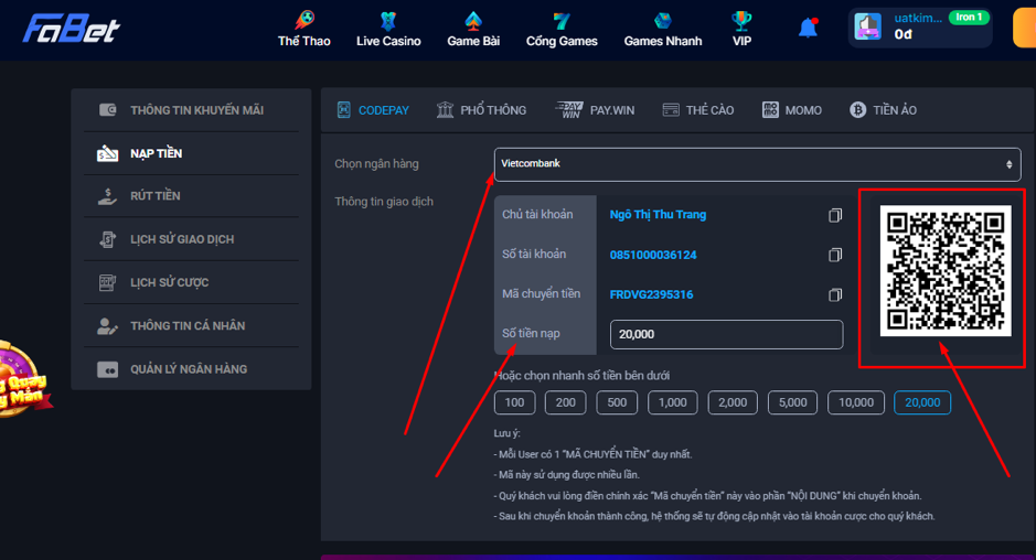 Lúc này, mã QR sẽ hiển thị ở góc phải và anh em chỉ cần vào tài khoản ngân hàng quét mã QR để xác nhận giao dịch.